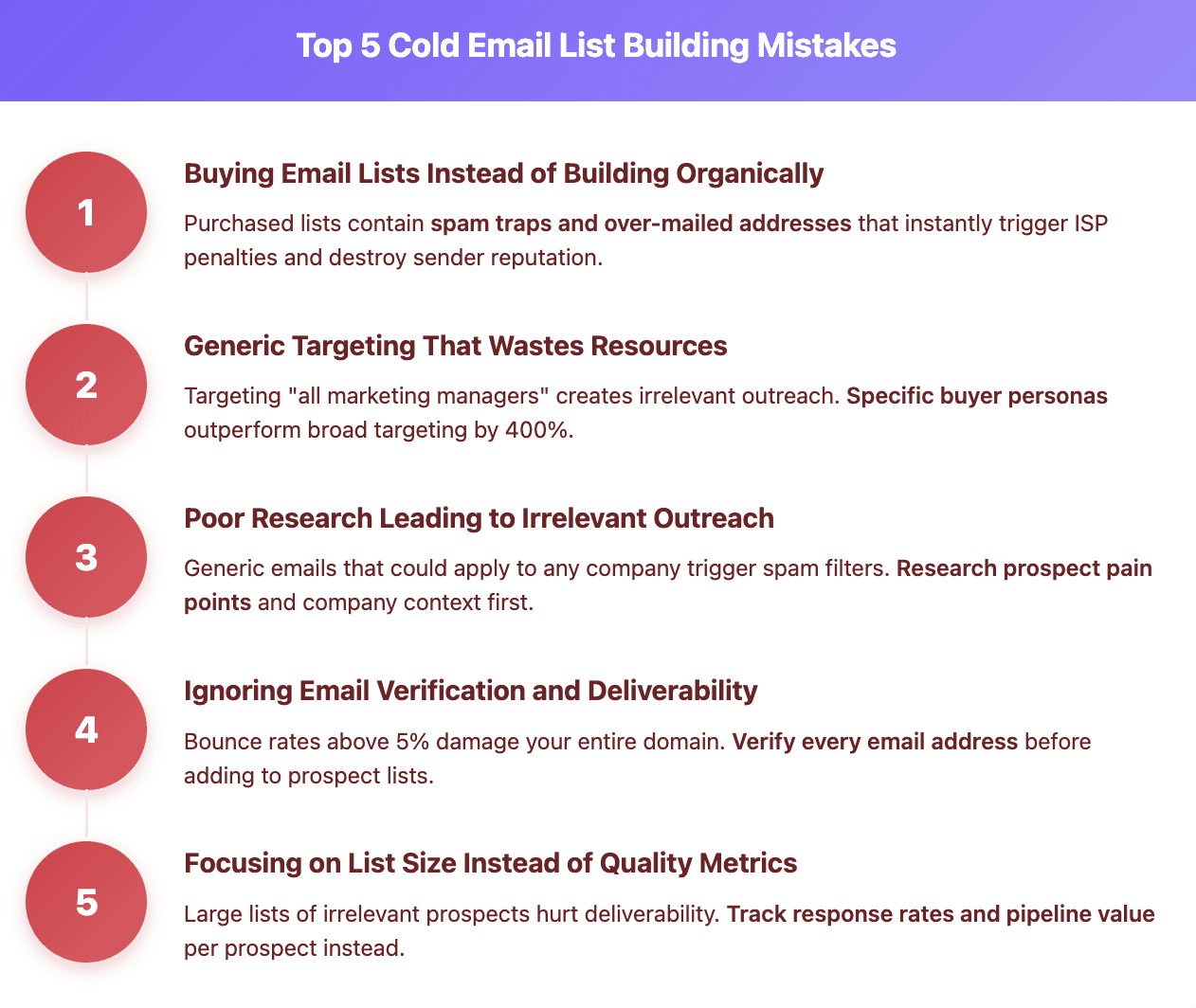 Cold email list building mistakes compound rapidly. Poor prospect research leads to irrelevant outreach, which triggers spam complaints, which damages deliverability for future campaigns, which pressures teams to send more volume, which further hurts reputation. This creates a death spiral that destroys outbound programs entirely.