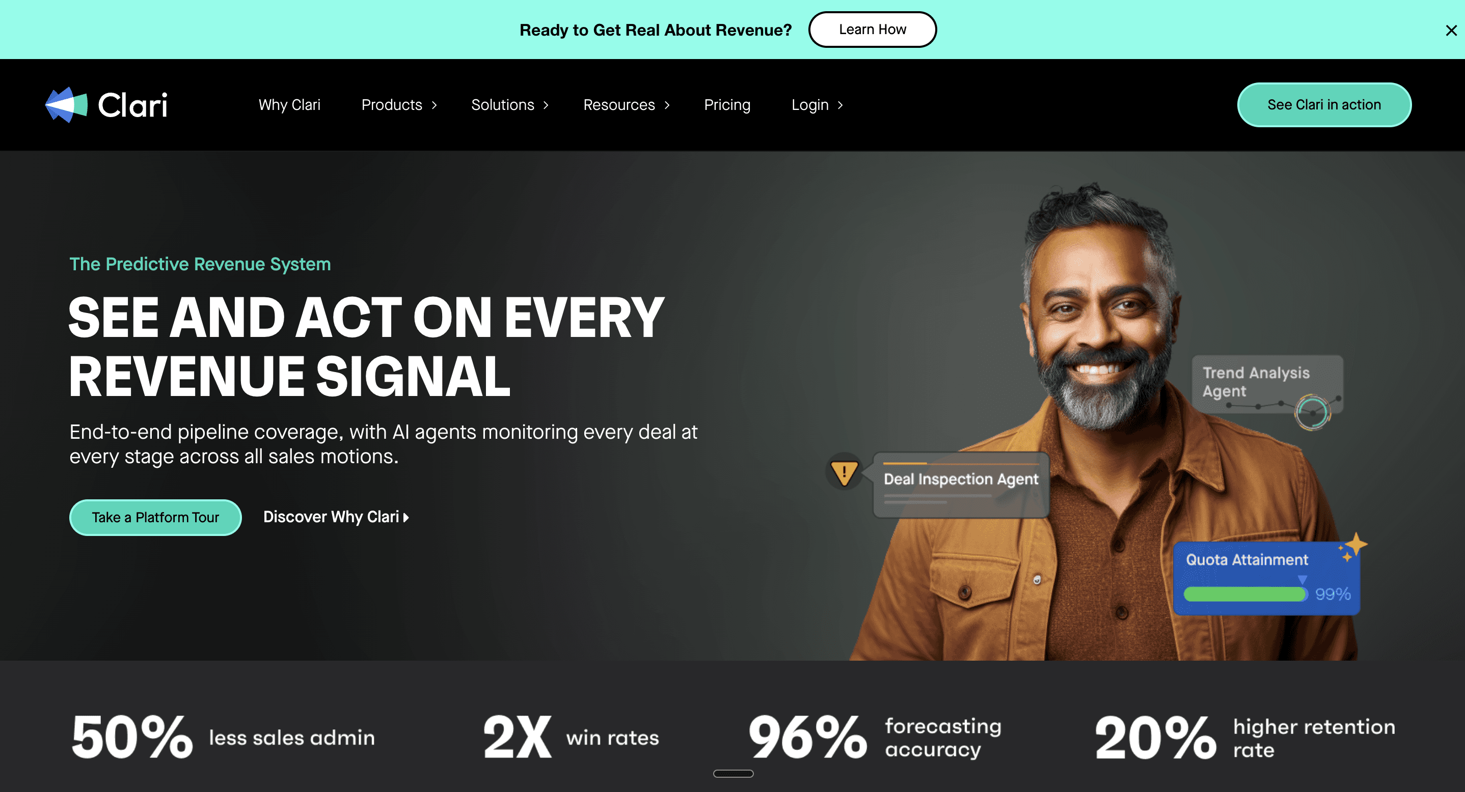 What it does: Clari is a revenue platform that uses AI to forecast pipeline, inspect deals, and predict revenue outcomes. It pulls data from your CRM, email, calendar, and conversation tools to build a unified view of deal health.