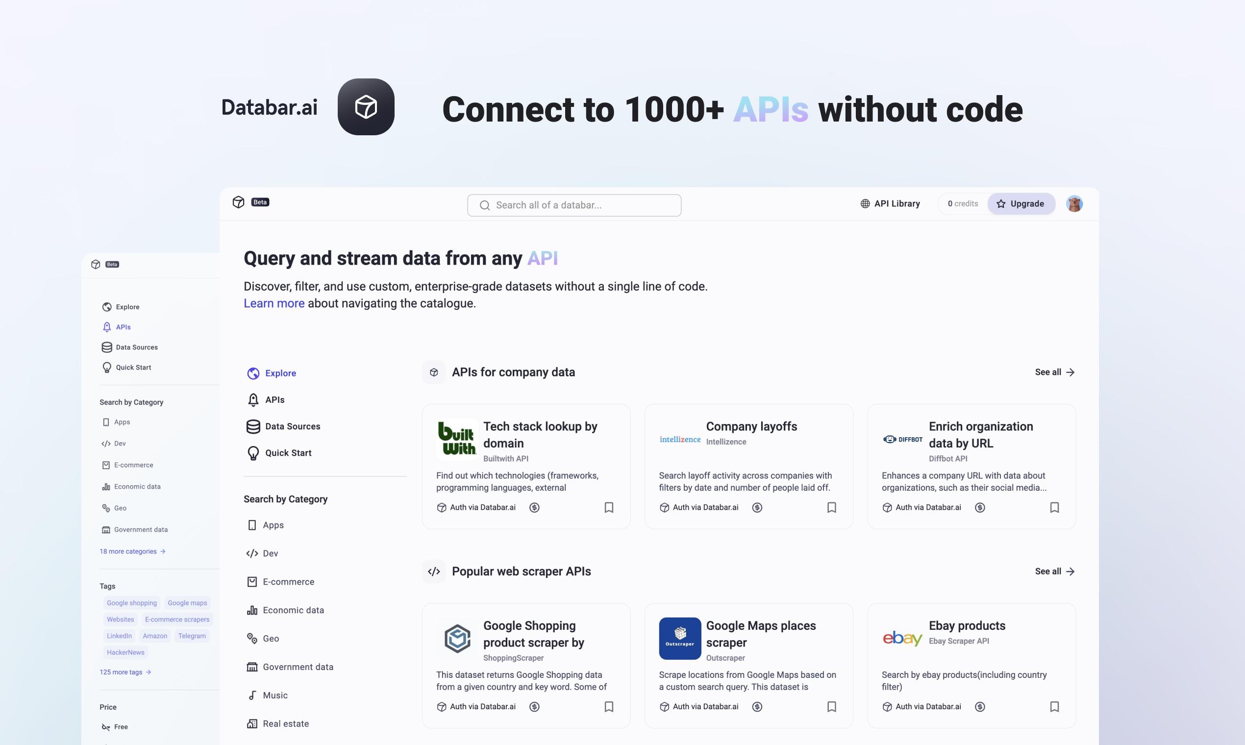 Databar is a powerful data automation tool that allows you to easily connect to APIs through a user-friendly spreadsheet interface. With Databar you can set up schedulers to automatically update your data, or enhance it with over 100 external data sources. No authorization is required for many data sources on the platform, allowing you to access all APIs out-of-the-box and without code.