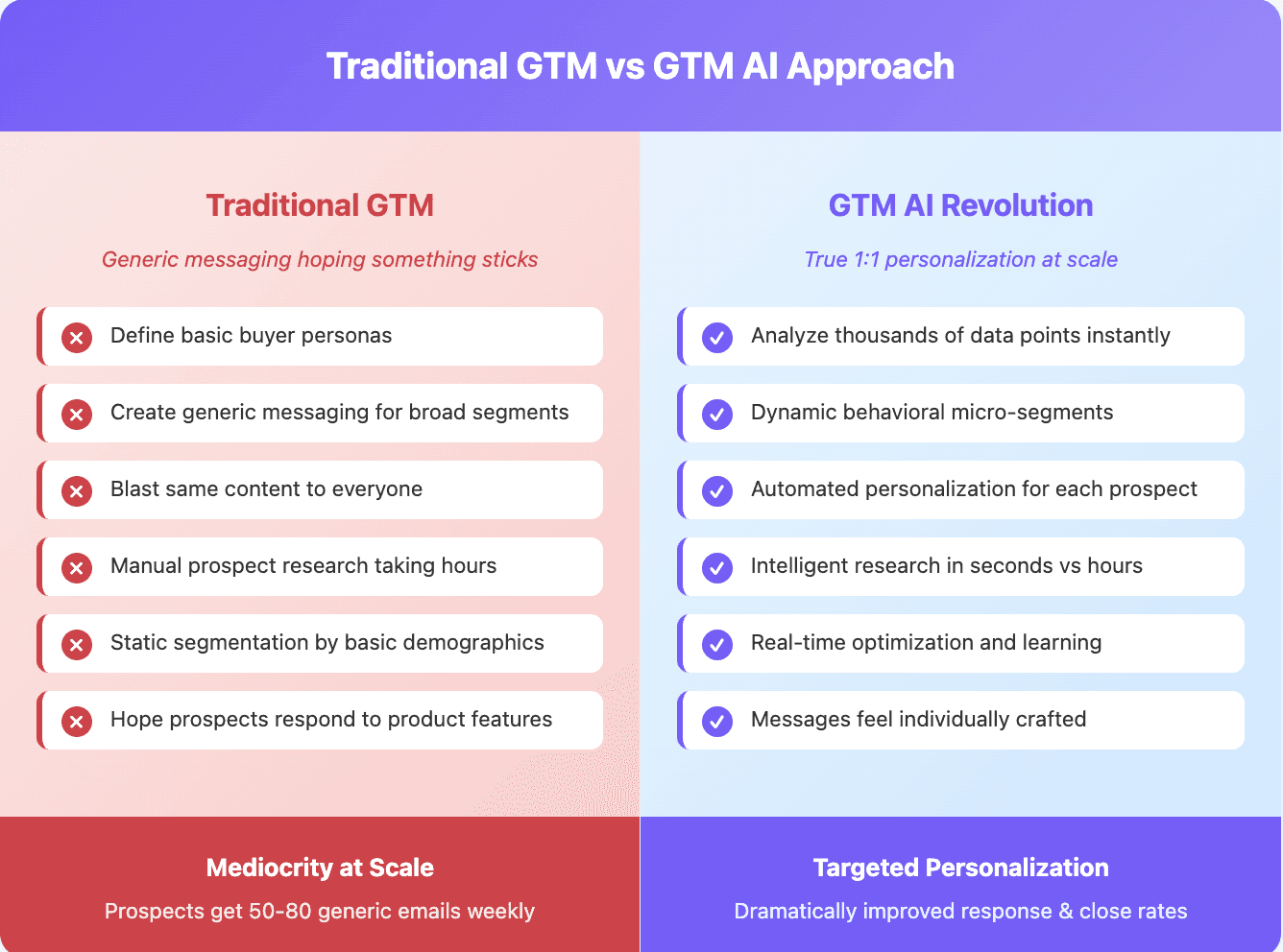 Think about traditional go-to-market approaches. You'd define your ideal customer profile, create some buyer personas, build generic messaging, and blast it out hoping something sticks. Maybe you'd do some basic segmentation by company size or industry.