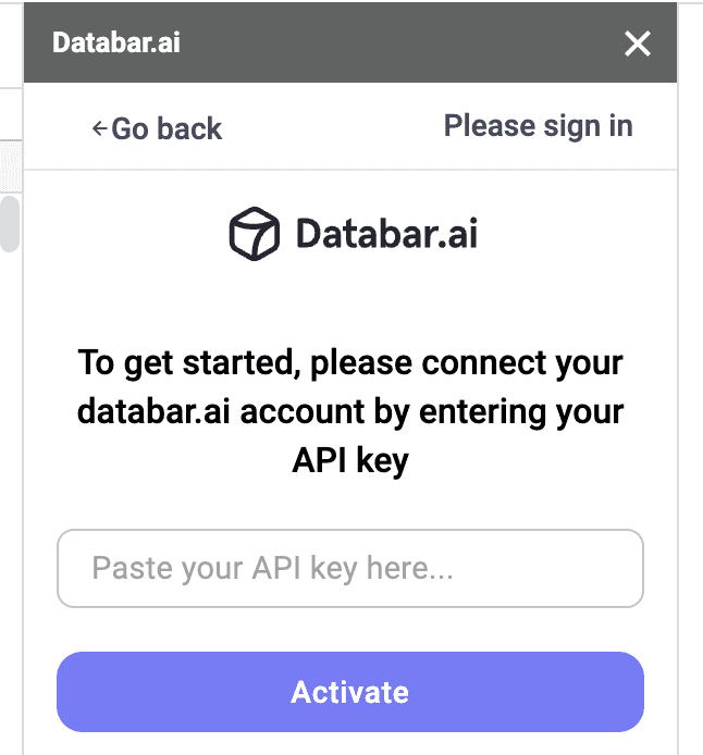 Once the extension elements appear on the sidebar, Login to Databar by entering your API key which can be found here.