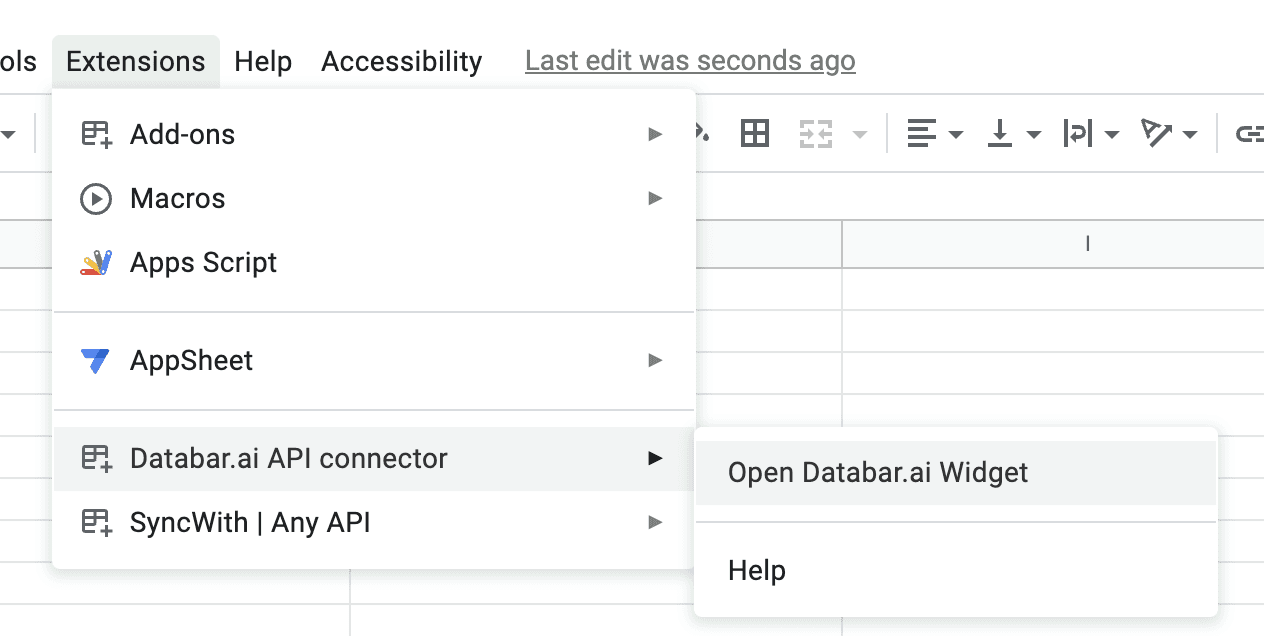 Open a Google Sheet and navigate to the Databar.ai API connector section under Extensions.