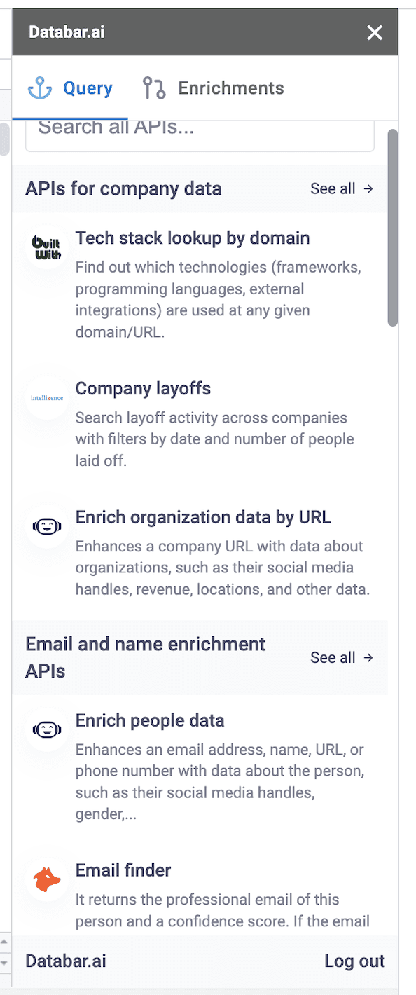 Once logged in, you'll see all the APIs available to query and enrich your sheets with.