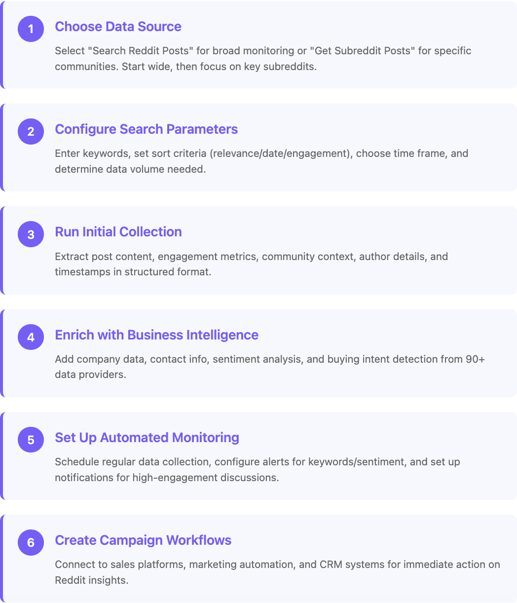 This approach delivers what traditional scraping cannot: complete business intelligence workflows that turn Reddit discussions into measurable business outcomes.