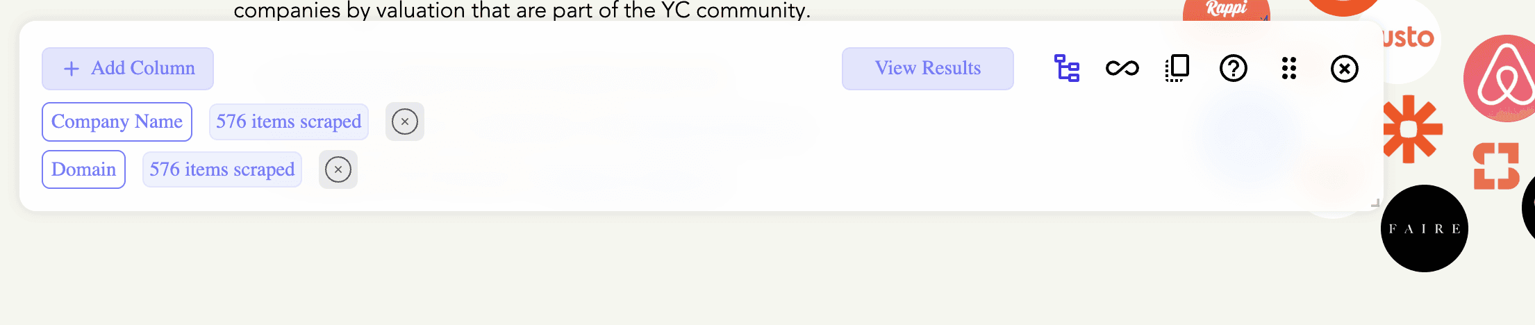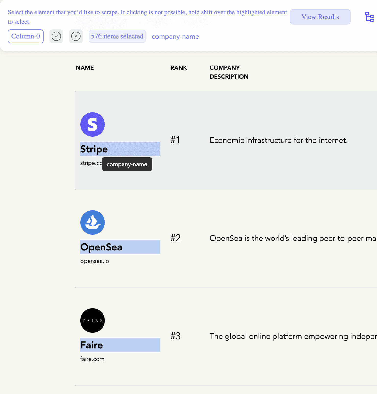 Add Columns and Values: Use the "New column" button and select the data you want to scrape from the webpage. In this example, we will be using the Company name as our first dataset - notice how all the other company names automatically highlighted.