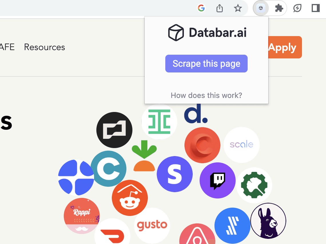 Initiate a New Job: Click on the Databar logo on the top right corner of your desktop, and select "Scrape this page" to start the scraping process. In this example, we are scraping data from the Y Combinator's list of top companies by valuation.