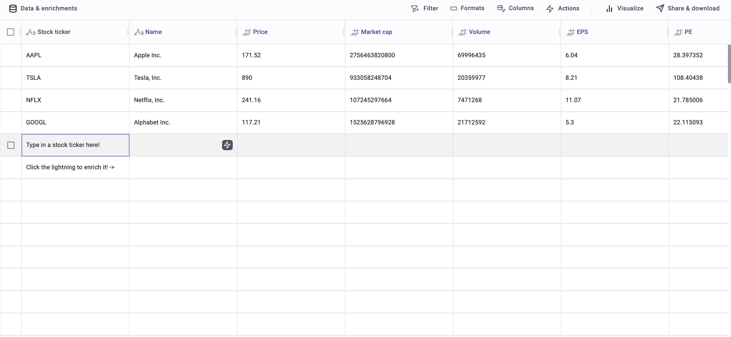 3) Input your desired stock ticker, and hit the lightning bolt to enrich it. Immediately the cells will fill with data! The cells will automatically update with live data upon click.